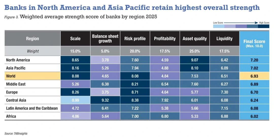 The weighted average strength score of the top 1,000 banks stands at 6.93 out of 10, with North American and Asia Pacific banks leading at 7.20 and 7.02, respectively. North American banks stand out in scale and asset quality, while Asia Pacific banks, compared with their North American peers, show stronger balance sheet growth, better risk profile and higher profitability, but lag in scale, asset quality and liquidity.