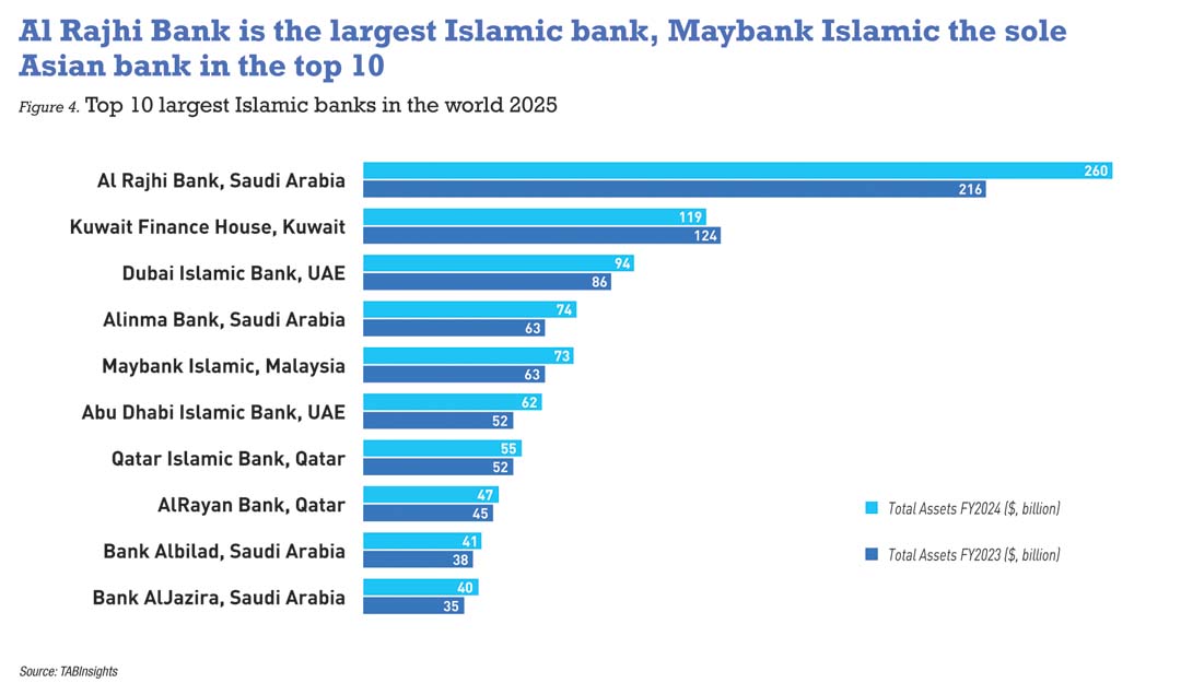Maybank Islamic ranks fifth, with $73 billion in assets at the end of FY2024, and is the only Asian institution among the global top 10. Its assets grew 13.6% in FY2024, following a 1% decline in the previous year due to a reduction in cash and cash equivalents. Among the top 10 Asian Islamic banks, seven are from Malaysia and one each from Bangladesh, Indonesia and Pakistan. Bank Syariah Indonesia, Islami Bank Bangladesh and Meezan Bank remain the largest institutions in their respective markets.
